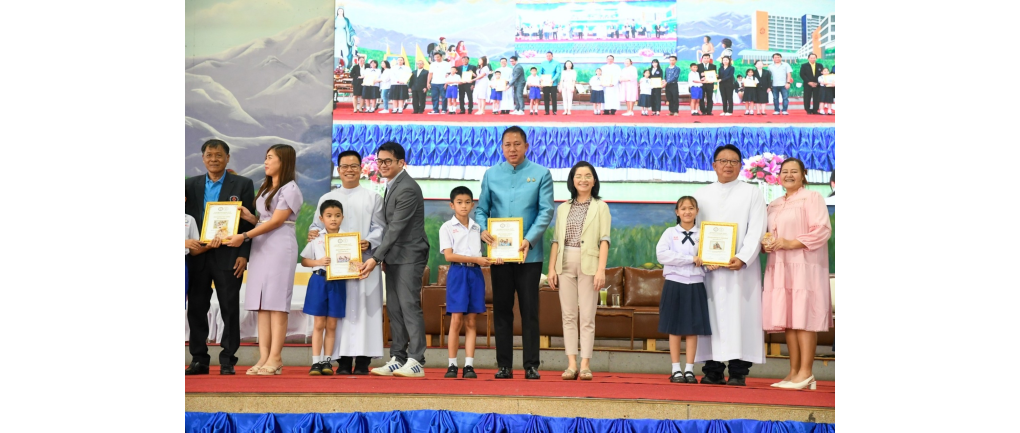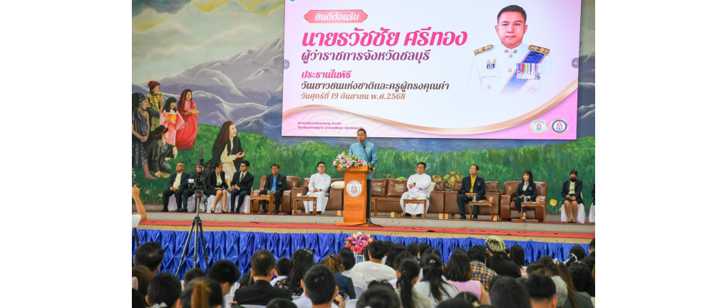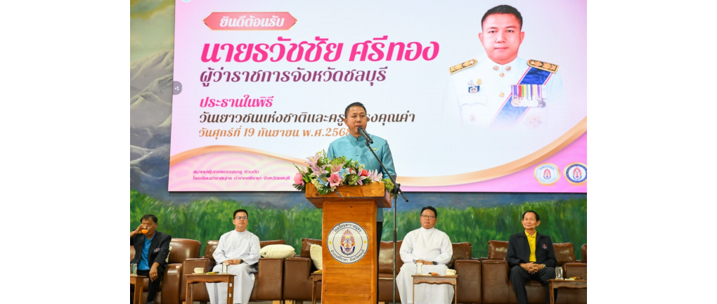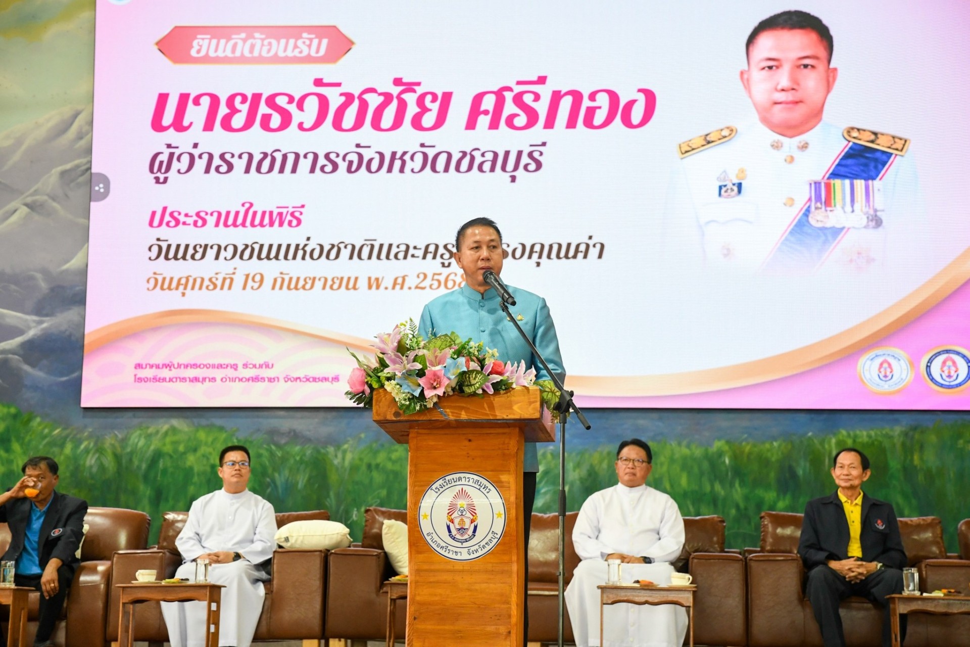 วันศุกร์ที่ 19 กันยายน 2568 เวลา 08.30 น. ณ ศาลารวมใจต้านภัยยาเสพติด โรงเรียนดาราสมุทร อำเภอศรีราชา จังหวัดชลบุรี นายธวัชชัย ศรีทอง ผู้ว่าราชการจังหวัดชลบุรี เป็นประธานเปิดกิจกรรมวันเยาวชนแห่งชาติและครูผู้ทรงคุณค่า ประจำปีการศึกษา 2568 โดยมีบาทหลวงลือชัย จันทร์โป๊ ผู้ลงนามแทนผู้รับใบอนุญาต/ผู้อำนวยการโรงเรียนดาราสมุทร นายบุญส่ง พันเสือ ที่ปรึกษาสมาคมผู้ปกครองและครูโรงเรียนดาราสมุทร คณะครู ผู้ปกครอง และนักเรียนเข้าร่วมงานอย่างคับคั่ง