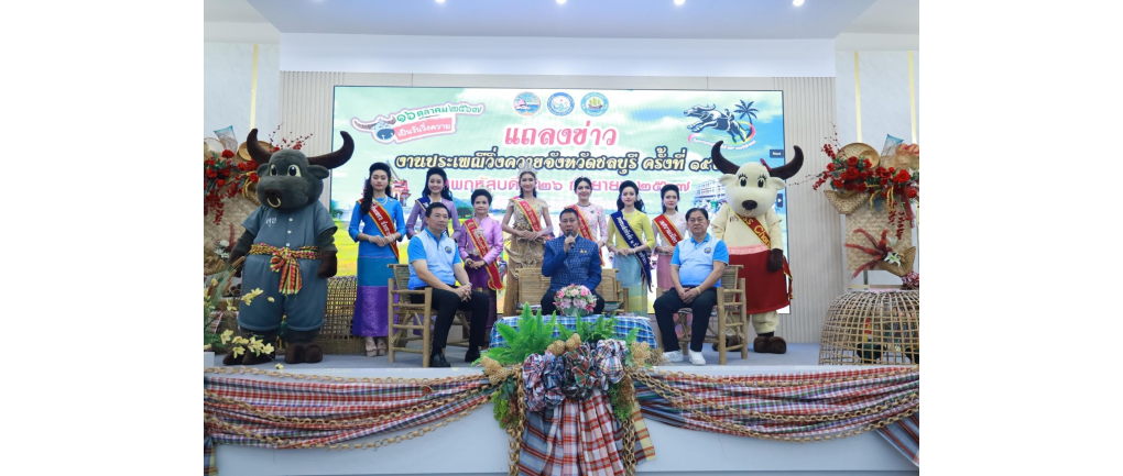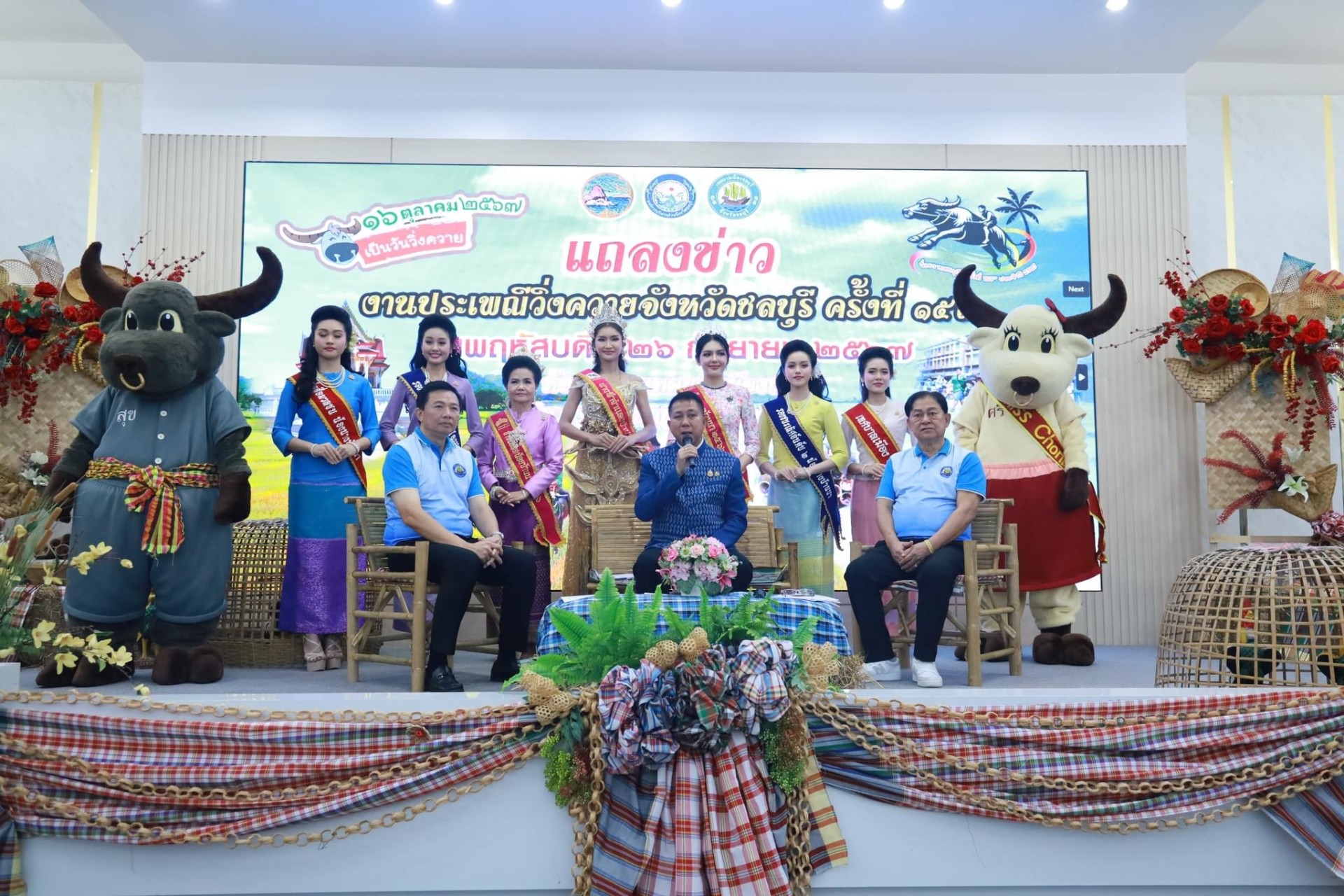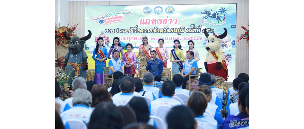 วันที่ 26 กันยายน 2567 เวลา 10.00 น. ณ ห้องประชุมเทศบาลเมืองชลบุรี นายธวัชชัย ศรีทอง ผู้ว่าราชการจังหวัดชลบุรี เป็นประธานการแถลงข่าวงานประเพณีวิ่งควาย ประจำปี 2567 ครั้งที่ 153 พร้อมด้วยนายวิทยา คุณปลื้ม นายกองค์การบริหารส่วนจังหวัดชลบุรี นางสาวสุดินา แก้วดี ท้องถิ่นจังหวัดชลบุรี นายสุติกรณ์ จำเริญพานิช นายกเทศมนตรีเมืองชลบุรี และหน่วยงานที่เกี่ยวข้องเข้าร่วมการแถลงข่าวอย่างมากมาย