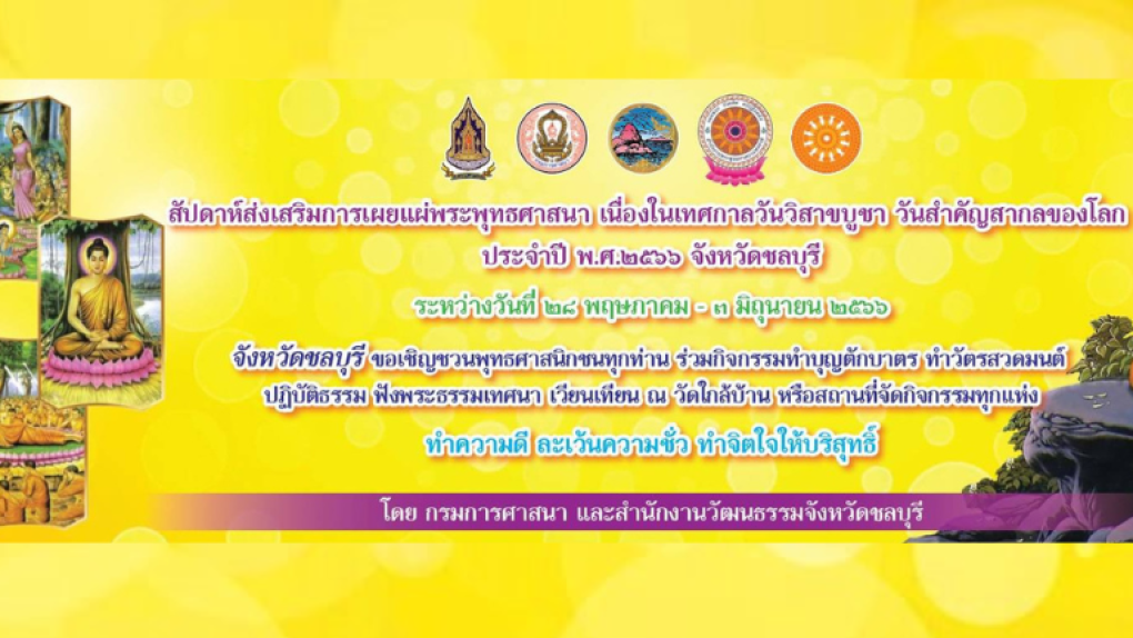 ขอเชิญร่วมพิธีเวียนเทียน กิจกรรมส่งเสริมพระพุทธศาสนา เนื่องในเทศกาลวันวิสาขบูชา พุทธศักราช 2566 จังหวัดชลบุรี
