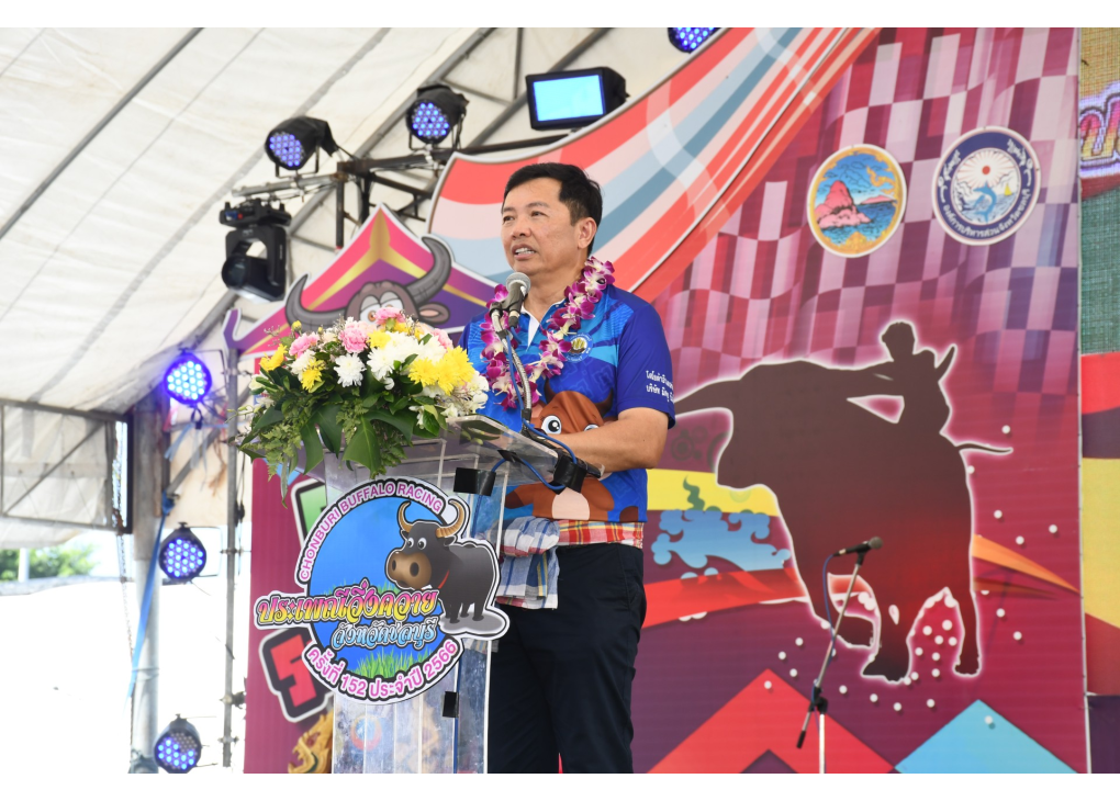 นายธวัชชัย ศรีทอง ผู้ว่าราชการจังหวัดชลบุรี กล่าวว่า คำว่า “วิ่งควาย” ได้ประกาศขึ้นทะเบียนเป็นมรดกภูมิปัญญาทางวัฒนธรรมของชาติประจำปีพุทธศักราช 2555 ประเภทกีฬาภูมิปัญญาไทย ซึ่งมีรูปแบบเอกลักษณ์ทางวัฒนธรรมที่ปฏิบัติสืบเนื่องกันมาเป็นระยะเวลาอันยาวนาน จนเป็นประเพณีท้องถิ่นคู่บ้านคู่เมืองของจังหวัดชลบุรี เห็นได้จากากรที่เกษตรกร ตกแต่งควายของตนเองให้สวยงาม ซึ่งถือเป็นการทำขวัญควาย และเกษตรกรที่อยู่ทั่วทุกสารทิศของจังหวัดชลบุรี ได้มีโอกาสมาพบประสังสรรค์และเปลี่ยนเรียนรู้ กล่าวได้ว่า งานประเพณีวิ่งควายในวันนี้ ถือเป็นวันนัดพบของเกษตรกรซึ่งได้รับคำยกย่องว่า เป็นกระดูกสันหลังของชาติ แต่เดิมในอดีต เกษตรกรจะนำควายบรรทุกผลผลิตทางการเกษตรมาขาย เวลากลังก็ซื้อข้าวของกลับไปทำบุญยังวัดใกล้บ้าน เมื่อมาถึงบริเวณตลาดท่าเกวียนก็จะนำวัวควายไปพักกินน้ำ เล่นน้ำที่สระน้ำใหญ่ หลังจากที่วัวควายกินน้ำและเล่นน้ำเป็นที่พอใจแล้วก็จะขี่ควายกลับมายังตลาดท่าเกวียน ขณะที่เกษตรกรขี่ควายกลับก็มีการวิ่งแข่งควายของตนมายังที่ตลาดท่าเกวียน เมื่อมีผู้พบเห็นก็เกิดความสนุกสนาน ให้มีการจัดแข่งขันวิ่งควายขึ้นทุกปี