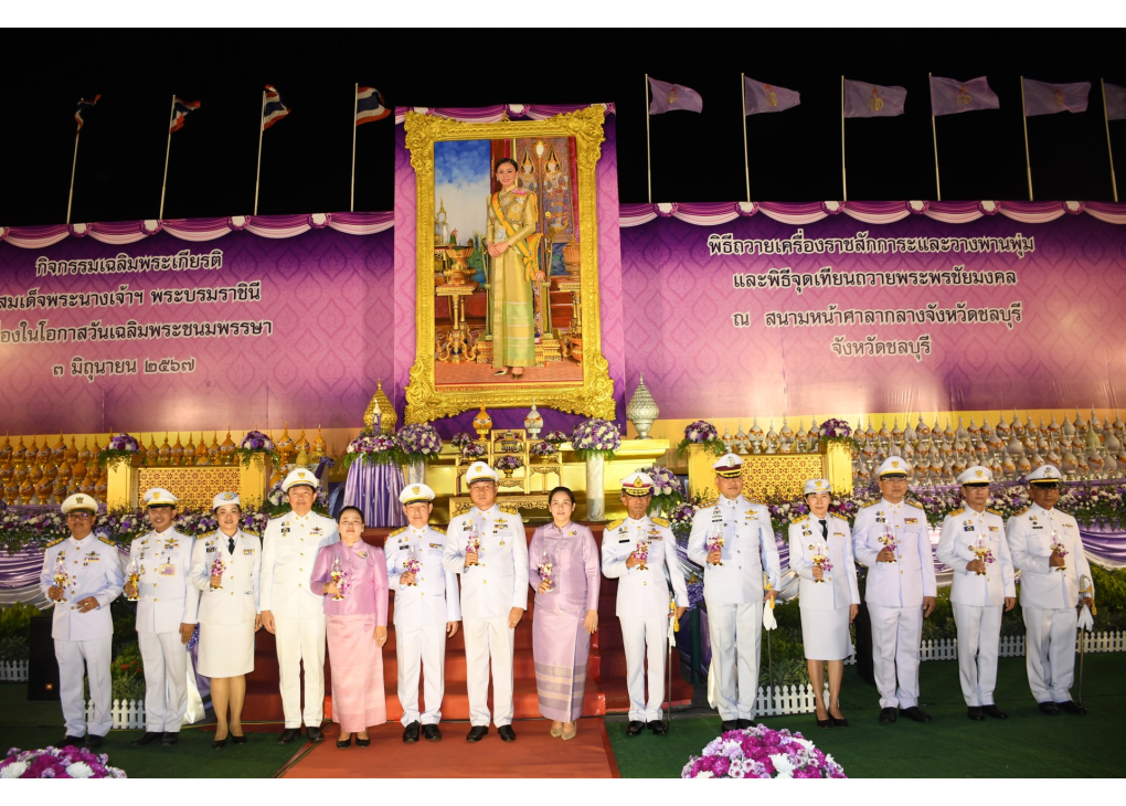นายธวัชชัย ศรีทอง ผู้ว่าราชการจังหวัดชลบุรี พร้อมด้วยนางสาวประภัสรา ศรีทอง นายกเหล่ากาชาดจังหวัดชลบุรี นำคณะข้าราชการ ทหาร ตำรวจ ศาลตุลาการ องค์กรปกครองส่วนท้องถิ่น และพ่อค้าประชาชนทุกหมู่เหล่า ร่วมพิธีถวายเครื่องราชสักการะและวางพานพุ่ม และจุดเทียนชัยถวายพระพรชัยมงคล เฉลิมพระเกียรติแด่สมเด็จพระนางเจ้าสุทิดา พัชรสุธาพิมลลักษณ พระบรมราชินี เนื่องในโอกาสมหามงคลเฉลิมพระชนมพรรษา 3 มิถุนายน 2567 เพื่อแสดงความจงรักภักดี และสำนึกในพระมหากรุณาธิคุณเป็นล้นพ้น ที่ไต้ฝ่าละอองธุลีพระบาท ทรงบำเพ็ญพระราชกรณียกิจนานัปการ ยังความร่มเย็นเป็นสุขแก่ปวงชนชาวไทย