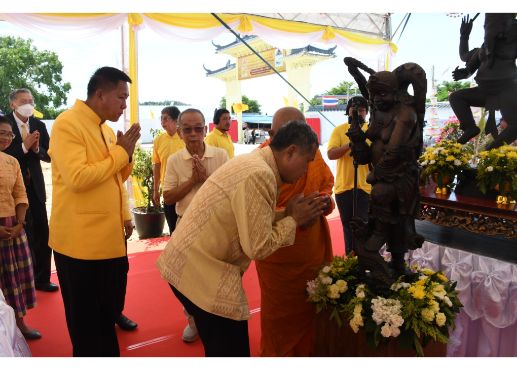 นายสุทธิพงษ์ จุลเจริญ ปลัดกระทรวงมหาดไทย กล่าวว่า การประกอบพิธีวางศิลาฤกษ์ก่อสร้างวัดมังกรธรรมนาวาราชาธิคุณ ถวายเป็นพระราชกุศลพระบาทสมเด็จพระเจ้าอยู่หัว เนื่องในโอกาสพระราชพิธีมหามงคลเฉลิมพระชนมพรรษา 6 รอบ 28 กรกฎาคม 2567 ในวันนี้ เกิดจากความมุ่งมั่นตั้งใจและศรัทธาอันแรงกล้าของคุณอาลัย พงศ์ไพโรจน์ และครอบครัว ในการน้อมนำปณิธานอันแรงกล้าของคุณไล่เจี้ยง แซ่ทั้ง ผู้ก่อตั้งโรงงานน้ำปลาทิพรส ต้นตระกูลพงศ์ไพโรจน์ มาดำเนินการพัฒนาปรับปรุงเสนาสนะ เพื่อสร้างวัดจีนเฉลิมพระเกียรติ พระบาทสมเด็จพระเจ้าอยู่หัว ซึ่งสถานที่ตั้งของวัดแห่งนี้ แต่เดิมเป็น "โรงธรรมนาวาเรือสำเภา" สร้างขึ้นในราวปีชวด ตรงกับ พ.ศ. 2491 โดยพระอาจารย์สุง ชาวจีนที่ออกบวชในนิกายเถรวาท โดยที่ดินทั้งหมดเป็นกรรมสิทธิ์ของคุณไล่เจี้ยง แช่ทั้ง