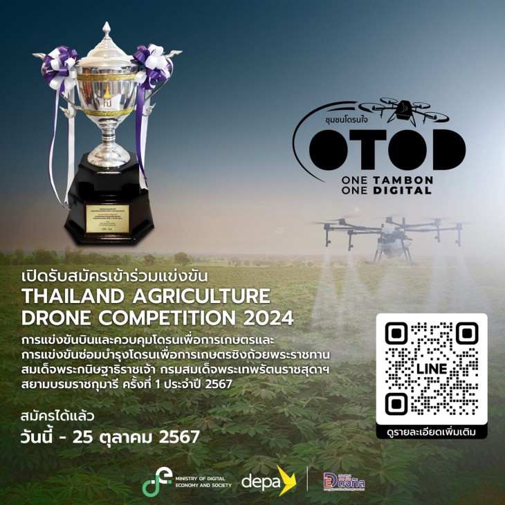 ขอชวนผู้สนใจร่วมประชันฝีมือในรายการ ‘Thailand Agriculture Drone Competition 2024’ การแข่งขันบินและควบคุมโดรนเพื่อการเกษตร และการแข่งขันซ่อมบำรุงโดรนเพื่อการเกษตรระดับประเทศ ครั้งที่ 1 ประจำปี 2567 ชิงถ้วยพระราชทาน สมเด็จพระกนิษฐาธิราชเจ้า กรมสมเด็จพระเทพรัตนราชสุดาฯ สยามบรมราชกุมารี พร้อมเงินรางวัลรวมมูลค่ากว่า 1 ล้านบาท