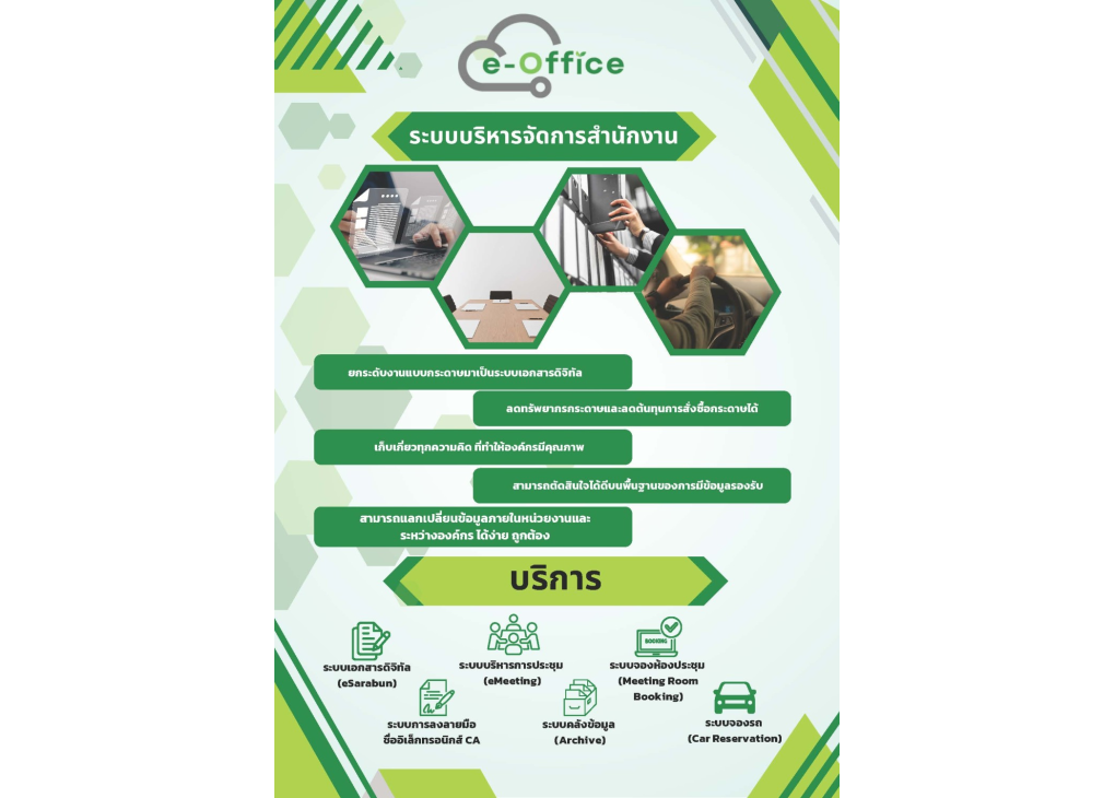 e-Office ระบบบริหารจัดการสำนักงานอิเล็กทรอนิกส์ ที่นำเทคโนโลยีดิจิทัลมาใช้ในการจัดการงานสำนักงาน สามารถใช้ในการ จัดการเอกสาร การติดตามงาน การอนุมัติเอกสาร บริหารการประชุม