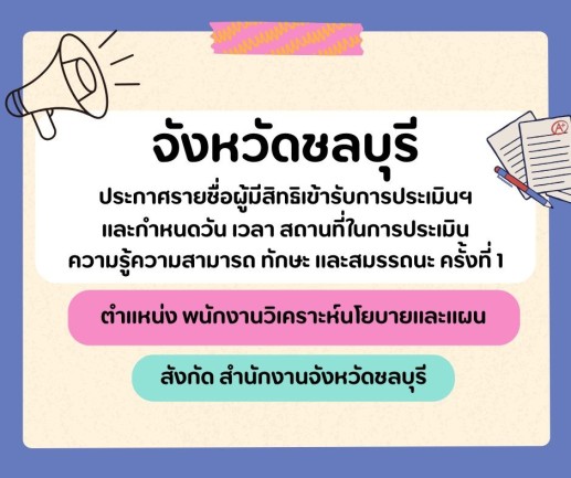 ประกาศรายชื่อผู้มีสิทธิเข้ารับการประเมินความรู้ความสามารถ ทักษะ และสมรรถนะ กำหนดวัน เวลา สถานที่ในการประเมินความรู้ความสามารถ ทักษะ และสมรรถนะ ในตำแหน่งพนักงานวิเคราะห์นโยบายและแผน